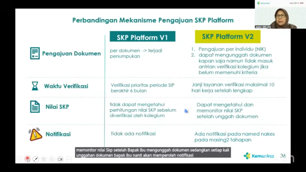 Dengan demikian, proses verifikasi Satuan Kredit Profesi oleh Kolegium yang biasanya memakan waktu lama kini ditargetkan menjadi lebih singkat. Sistem terbaru ini menyediakan notifikasi otomatis kepada Tenaga Medis dan Tenaga Kesehatan apabila terdapat kekurangan dokumen atau kesalahan dalam pelaporan. Fitur ini mempercepat perbaikan data karena Tenaga Medis dan Tenaga Kesehatan langsung menerima pemberitahuan tentang status dokumen mereka. Bahkan, Ditjen SDMK berharap versi terbaru ini dapat memperkuat integrasi data antara Lembaga Pelatihan Kemenkes dan platform SKP. “Kami menargetkan percepatan waktu verifikasi hingga 50% dibandingkan versi sebelumnya, asalkan data yang diinput oleh Tenaga Medis dan Tenaga Kesehatan sudah lengkap,” ujar perwakilan Ditjen SDMK dalam sesi refreshment tersebut [Sumber: Sosialisasi Ditjen SDMK Kemenkes].